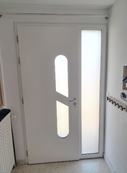 Configuration : Ensemble composé d'un vantail principal accompagné d'un fixe latéral à gauche, idéal pour apporter de la luminosité naturelle à l'entrée.